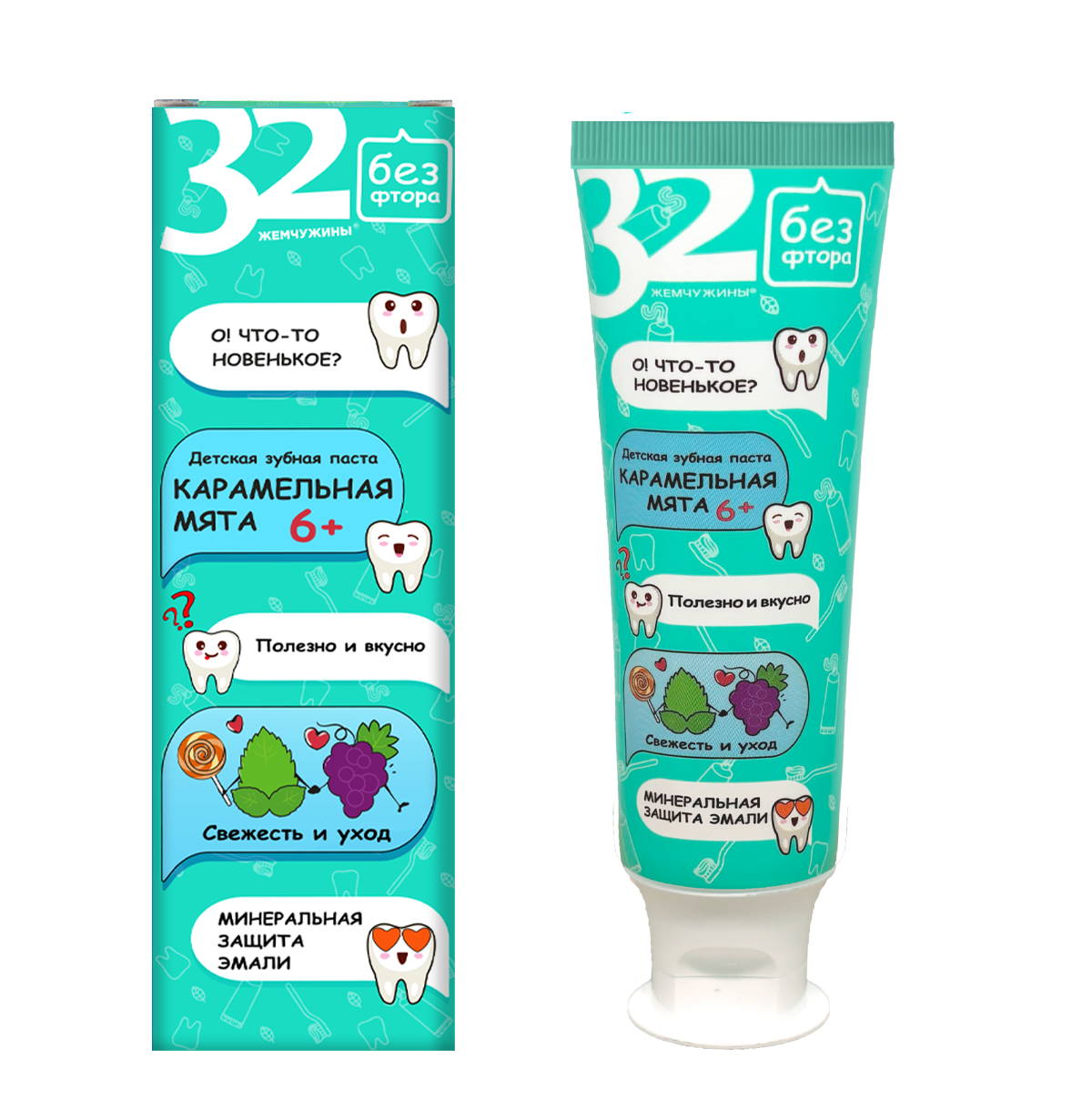 • Паста зубная детская 32 ЖЕМЧУЖИНЫ 6+ Карамельная мята, 75г